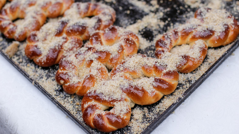 Se adaugă 250 ml de lapte călduț, două gălbenușuri, 80 de grame de unt topit, coaja de lămâie și zahărul vanilat, amestecând până se omogenizează. Aluatul se frământă 8-10 minute, apoi se lasă la dospit 60-90 de minute, până își dublează volumul.